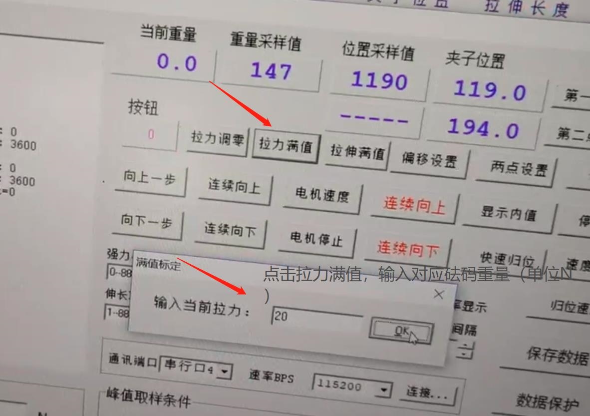 第四步:點(diǎn)擊拉力調(diào)零,在上夾具處掛上砝碼,保證砝碼靜止不動(dòng),然后看一下“當(dāng)前重量”處的值,如果不是,再點(diǎn)擊上圖中的“拉力滿(mǎn)值”輸入砝碼對(duì)應(yīng)重量值(N)即可。