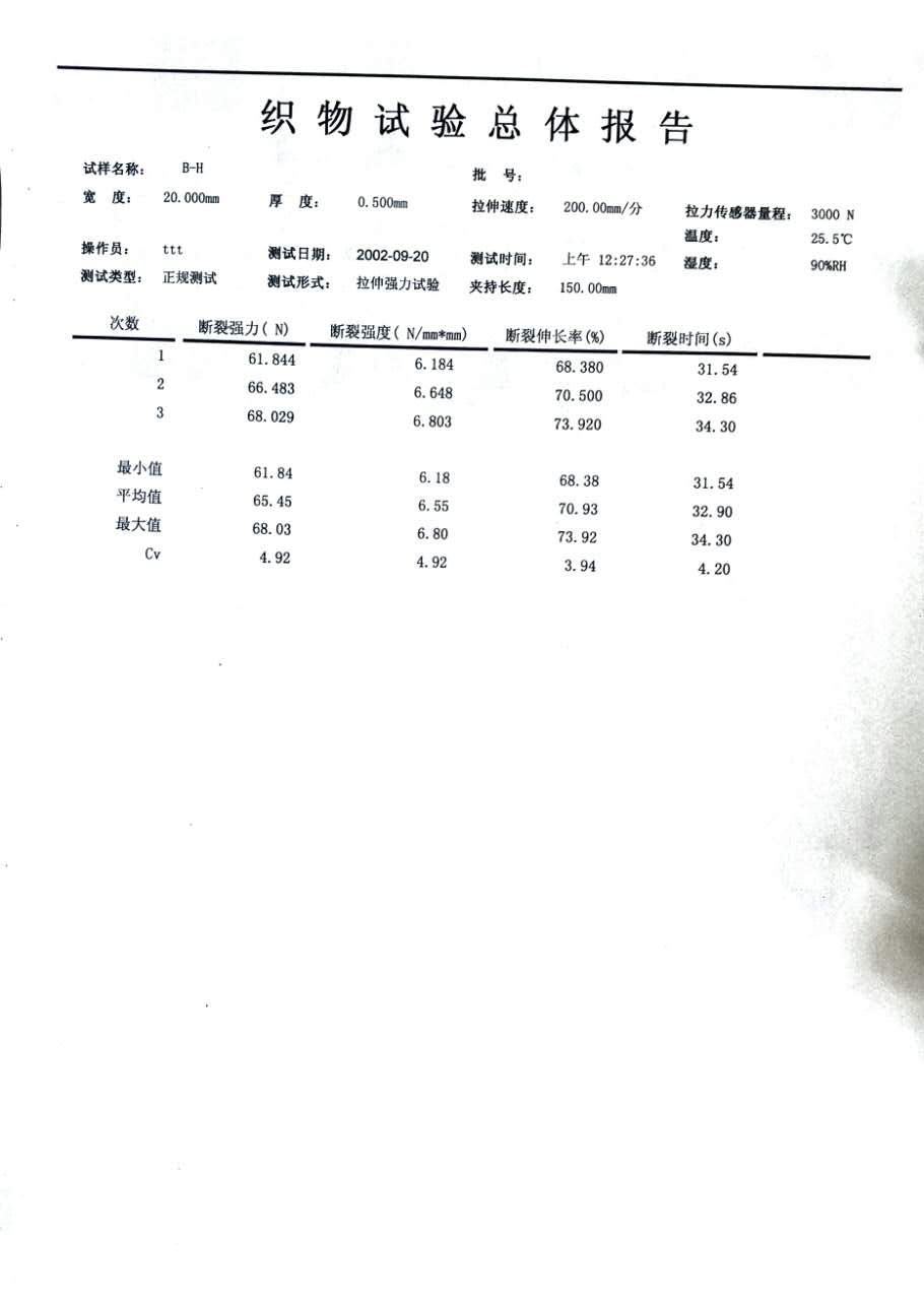 三、打開測量軟件,軟件上設(shè)定好200mm/min的速度后,夾持器會以200mm/min的速度做等速運(yùn)動,至無紡布被拉斷后,儀器記錄無紡布樣品的斷裂強(qiáng)力,斷裂伸長率,斷裂時間,斷裂強(qiáng)度等指標(biāo)??梢栽诔绦蛏显O(shè)定好每次要做的次數(shù),此次試驗(yàn)我們給用戶做三次,三次做完后程序上會自動計算這三次的^大值,^小值和平均值(斷裂強(qiáng)力,斷裂伸長率,斷裂強(qiáng)度,斷裂時間)。下圖是橫向無紡布樣品的測試報告,測試的機(jī)型為YG026B型織物強(qiáng)力機(jī),拉力傳感器量程為3000N。