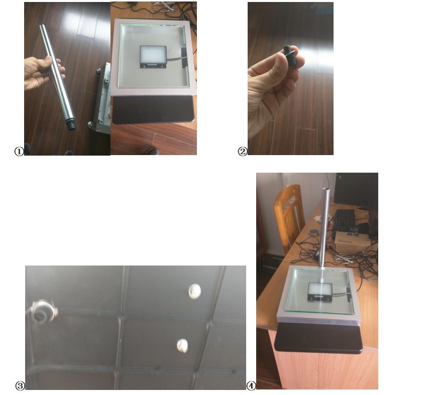 ①.1.取出底座和立柱(①),旋下立柱底部螺絲(②),將立柱固定在鏡檢儀底座(③④);