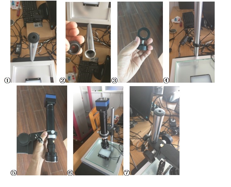 ②.去下立柱頂部蓋帽(①②),取出定位環(huán)(③),將定位環(huán)套在立柱上(④),取出鏡頭和滾輪調(diào)焦機(jī)構(gòu)(⑤),將機(jī)構(gòu)安裝到立柱上(⑥),蓋上蓋帽(⑦);