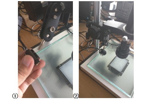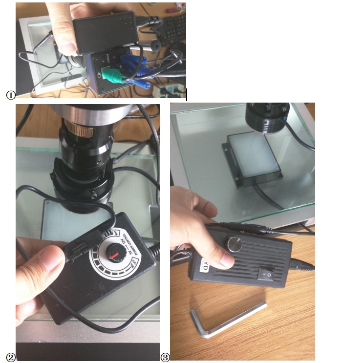 ④.相機(jī)的連接如圖①,上光源連接如圖②,底部光源連接如圖③,然后將鏡檢儀與顯示器相連接。
