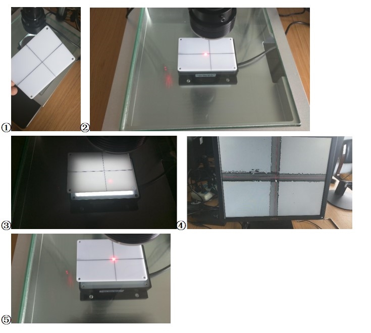 ⑤.5.取出標(biāo)定板(①),將標(biāo)定板放在工作臺(tái)上(②),打開(kāi)底部光源(③),移動(dòng)標(biāo)定板使十字線呈現(xiàn)在屏幕中心(④),將定位點(diǎn)光源移動(dòng)至標(biāo)定板中心(⑤)。