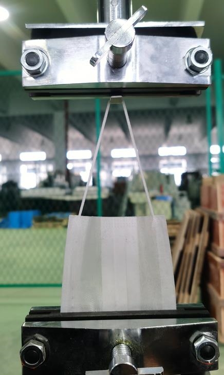 用適當(dāng)?shù)膴A具分別固定口罩耳帶和口罩體,啟動YG026B型織物強(qiáng)力機(jī),施加軸向拉力至10N,持續(xù)10s,記錄是否出現(xiàn)斷裂、滑脫和變形現(xiàn)象。