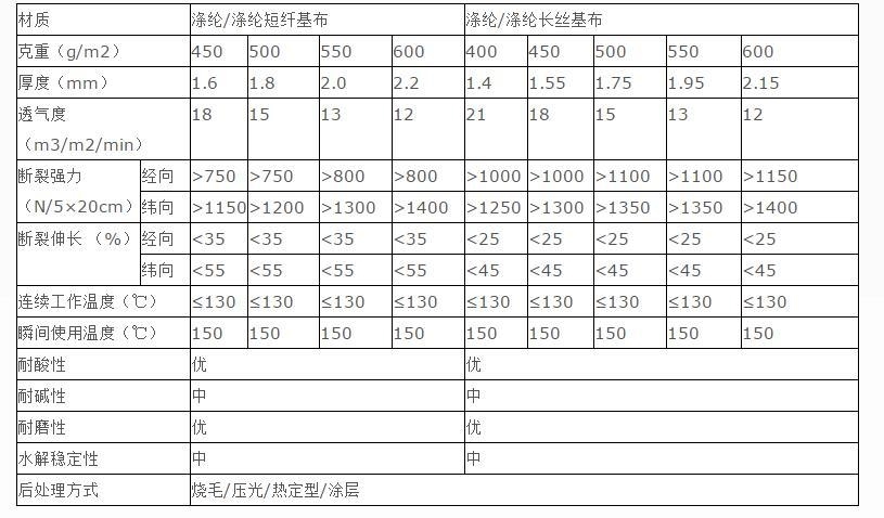 滌綸優(yōu)質(zhì)細(xì)旦大化纖維絲,以先進(jìn)設(shè)備生產(chǎn)滌綸(聚酯)纖維針刺過(guò)濾氈,可將多種纖維均勻定量混合,再用多臺(tái)混開棉機(jī)組及梳理機(jī)組利于纖網(wǎng)之間不同纖維間層裝復(fù)合、梯度變換。該產(chǎn)品除具有普通氈類濾布特有的空隙度高、透氣性好、集塵效率高、使用壽命長(zhǎng)等優(yōu)點(diǎn)外,因其耐溫等級(jí)適中,瞬間可達(dá)150℃,耐酸、耐堿適中的特點(diǎn)外而且具有非常好的耐磨性,故它是氈類濾材中使用量大的一個(gè)品種。