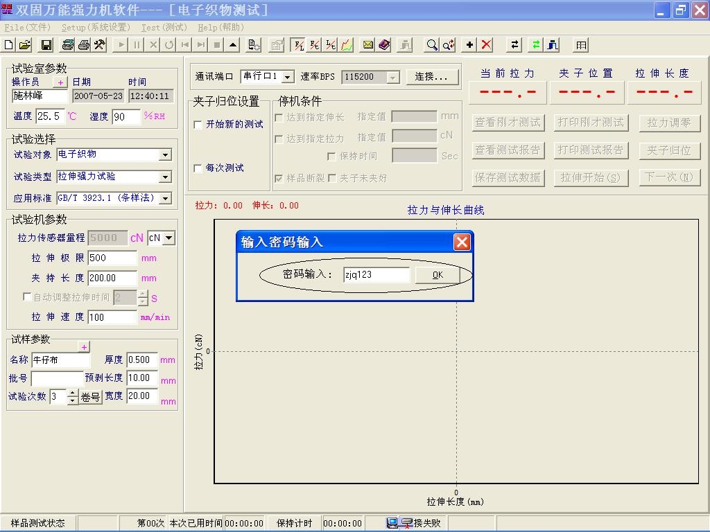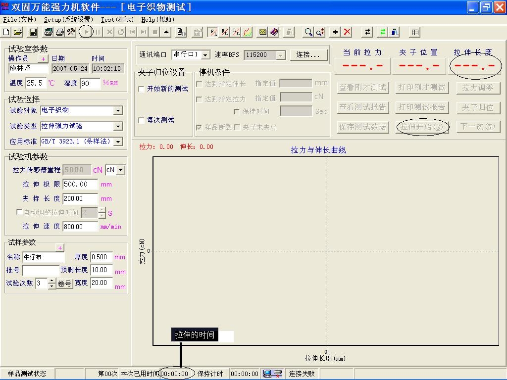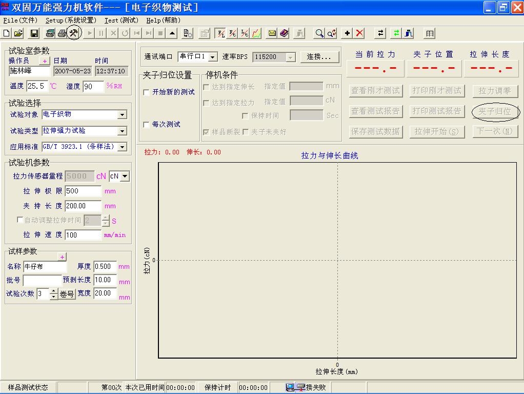 1打開程序做測(cè)試時(shí),點(diǎn)擊程序中的“開始測(cè)試”按鈕,待儀器走到設(shè)定的位置后,點(diǎn)擊“拉伸開始”,儀器的拉動(dòng)夾頭(下夾頭)開始以設(shè)定好的速度下降。如下圖:
