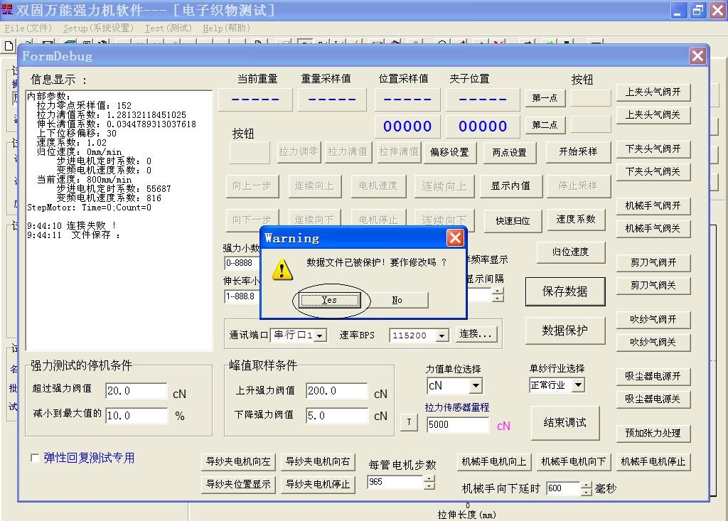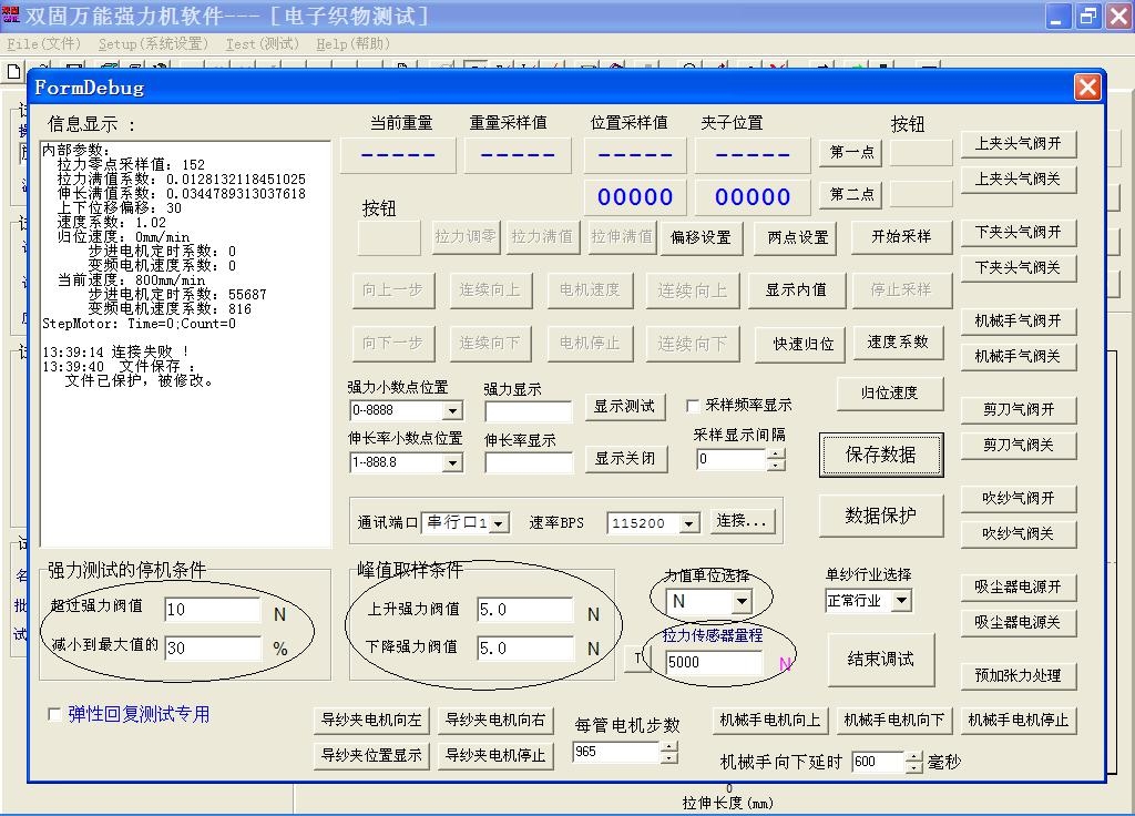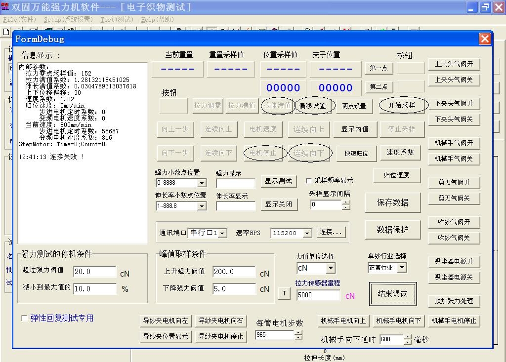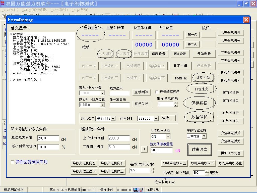 4這是織物強(qiáng)力機(jī)的一些設(shè)置,單紗強(qiáng)力機(jī)的有些地方需要變一下,如下圖: