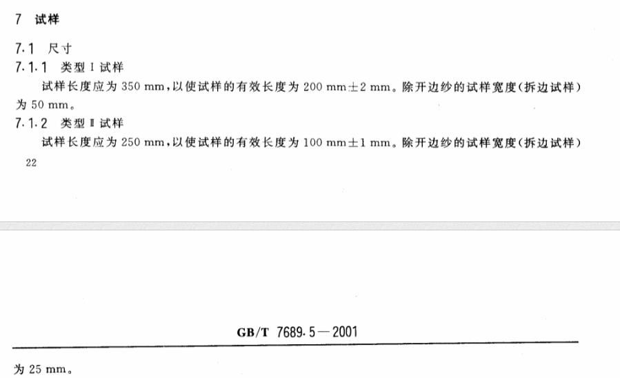 第二種試樣長度為250mm,試樣有效長度為100mm,除開邊紗的試樣寬度應為25mm。