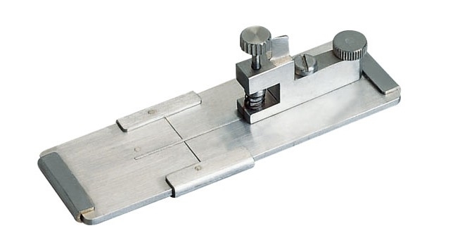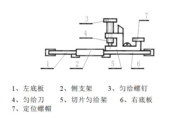 切片器結(jié)構(gòu)如右圖所示。切片器由左右兩塊1.6mm厚的底板組成切片器底板,左右底板上有寬為0.8mm的嵌樣槽,它與左底板上的塞片配合將試樣推緊。在試樣上方有勻給刀,調(diào)節(jié)勻給螺釘,可控制試樣伸出底板的厚度。用刀片在底板部下方切得試樣薄片。