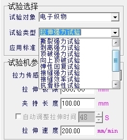 【YG026B型電子織物強力機軟件試驗類型選擇(可完成拉伸,撕破,剝離,頂破,接縫滑移等功能)】