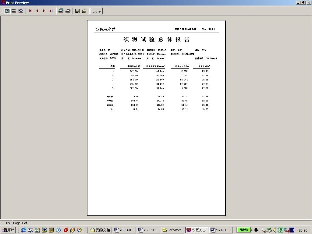 【YG026B型電子織物強力機軟件測試報告打印界面】